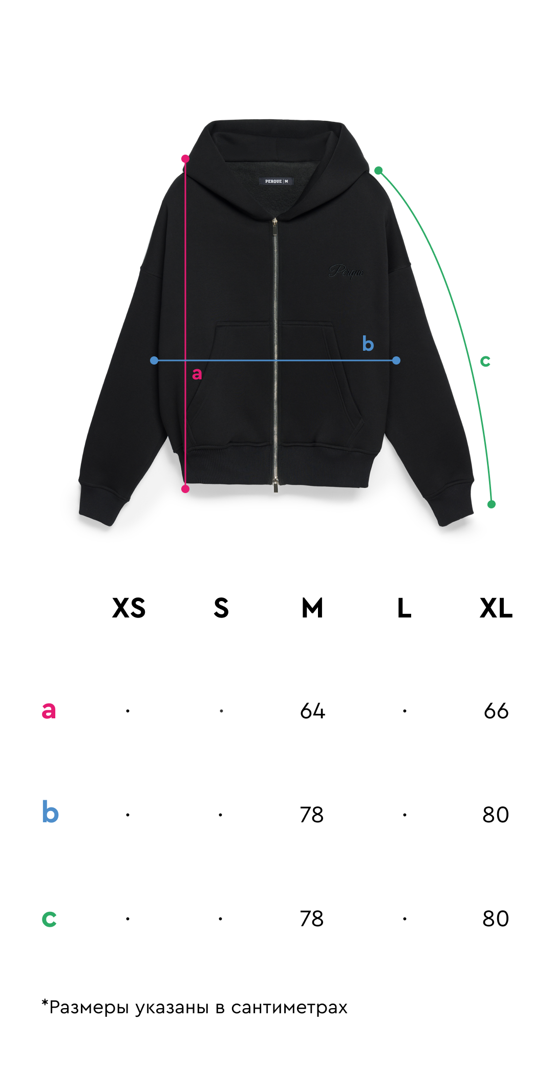 Мягкая ткань с начесом, широкие плечи, капюшон с чёткой геометрией. Минимум деталей - только вышивка Perque на груди, едва заметная, как подпись. Сзади вышиты фирменные ребра Оверсайз, НО кроп фит, двойная молния, передний карман. Создано не для того, чтобы выделяться — а чтобы держать форму, когда всё вокруг рушится.
